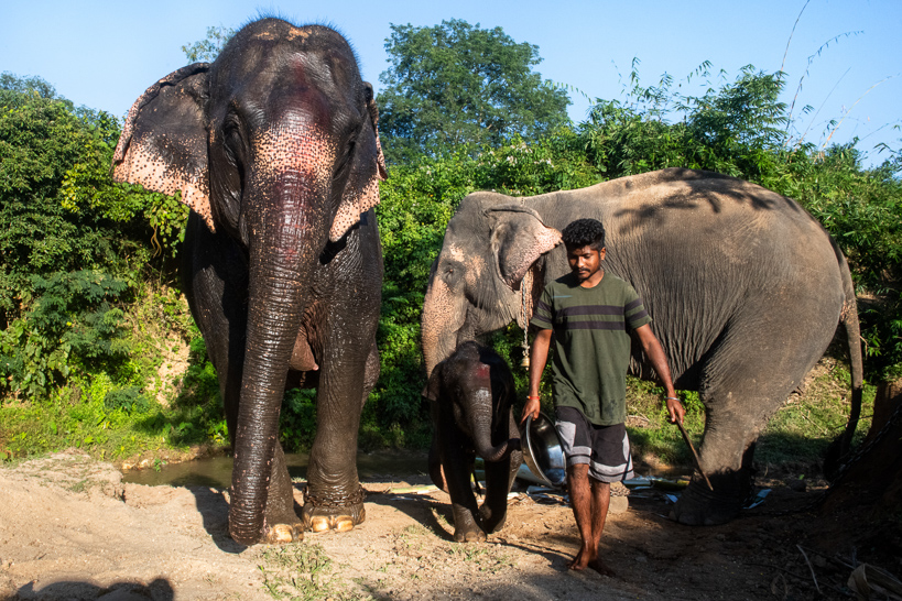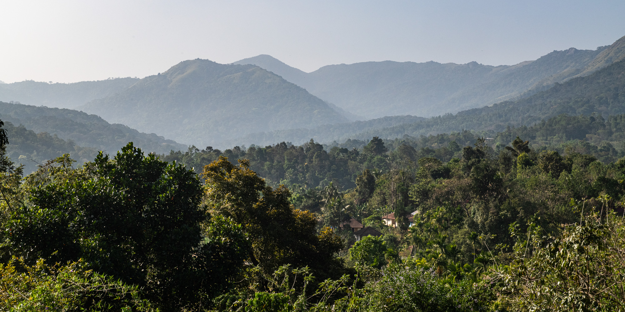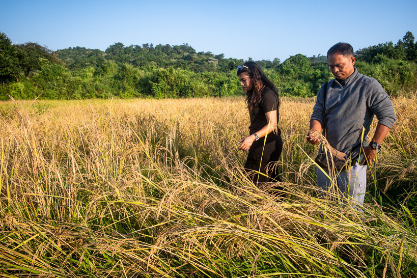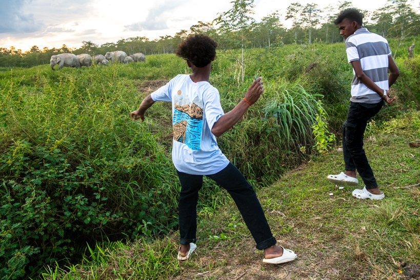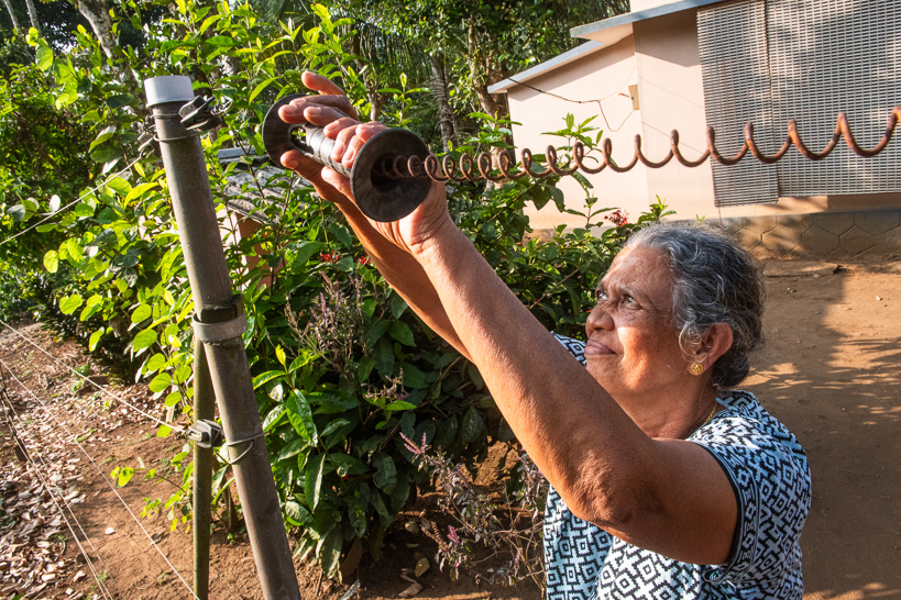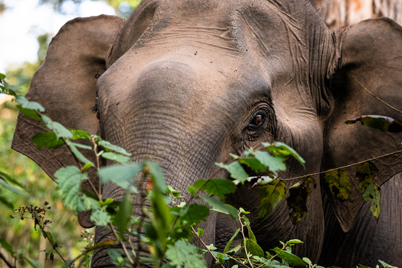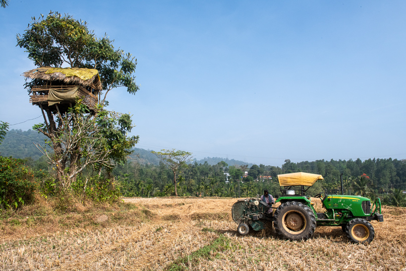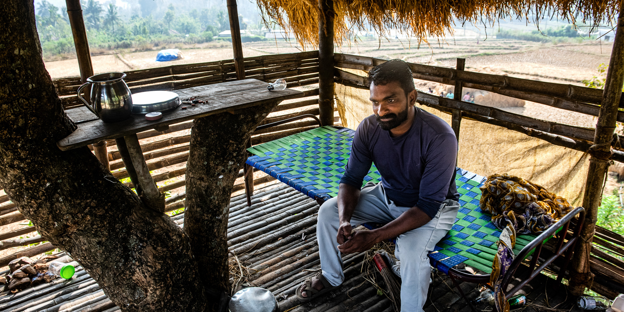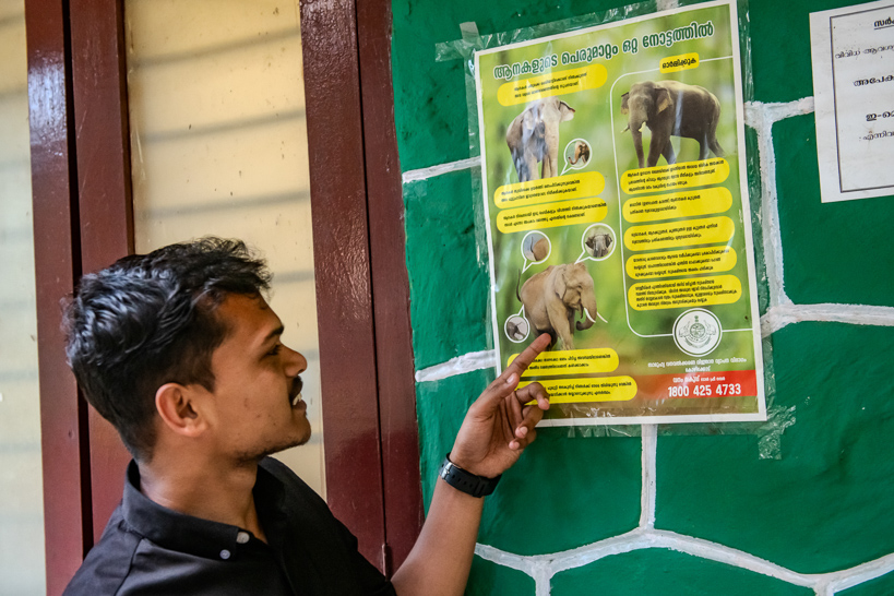 Shibukuttan, garde forestier, inspecte un jeune casse-marron (Senna spectabilis). Cette plante invasive a été introduite dans les années 1980 par le Gouvernement indien pour ombrager les routes et servir d'ornement. Elle s'est rapidement répandue dans les forêts méridionales du pays. Elle forme de denses bosquets, étouffe les espèces locales et modifie la chimie des sols. Ces feuilles, qui ne sont pas comestibles, privent les herbivores de nourriture.