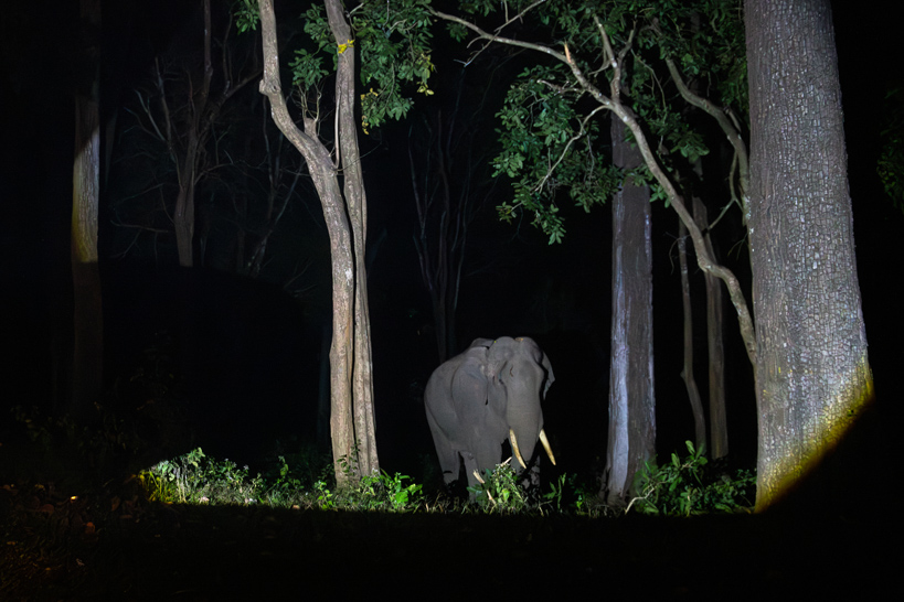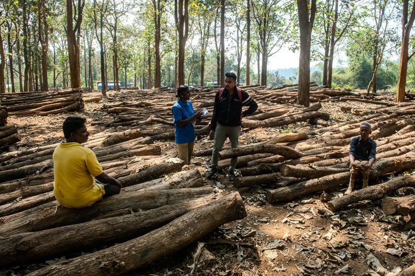 Des employés du service des forêts procèdent au comptage des grumes de teck issues des forêts de la Réserve faunistique de Wayanad. Environ un tiers de ce massif est couvert de plantations d'arbres tels que le teck (Tectona grandis), le palissandre (Dalbergia latifolia), l'eucalyptus et le silver oak (Grevillea robusta), souvent introduits pour la production de bois d'œuvre ou pour servir d'ombrage aux cultures (thé, café, épices).