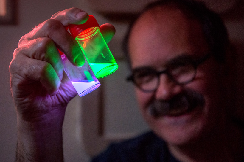 Marcel Koken démontre les principes de la fluorescence. Dans chaque flacon, un type de fluor différent, montrant le spectre des couleurs produites par fluorescence.