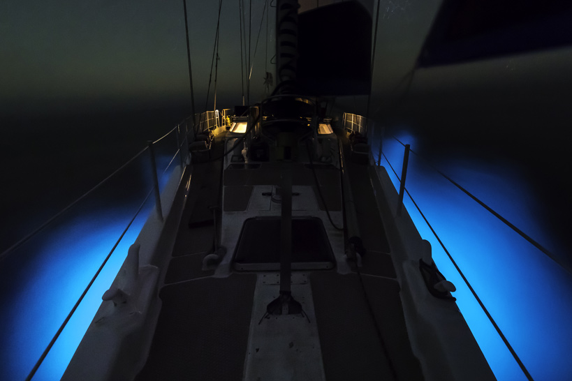 Le Why glisse sur une mer chargée de plancton fluorescent. Cette image a été réalisée dans la nuit noire, sans lumière artificielle. La biofluorescence est partout : elle s'active au passage du bateau, sous l'effet de friction de la coque.