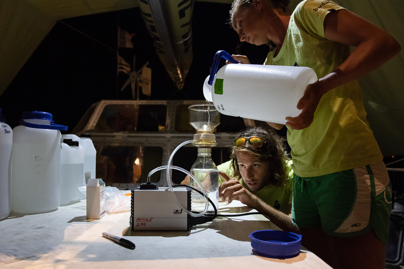 Ghislain Bardout et son équipe sont de retour en surface après avoir posé les capteurs de température, de lumière, et les hydrophones, alors qu'une autre équipe de plongeur a effectué des prélèvements qui sont immédiatement traités par les scientifiques Héloïse Rouzé et Michel Pichon.