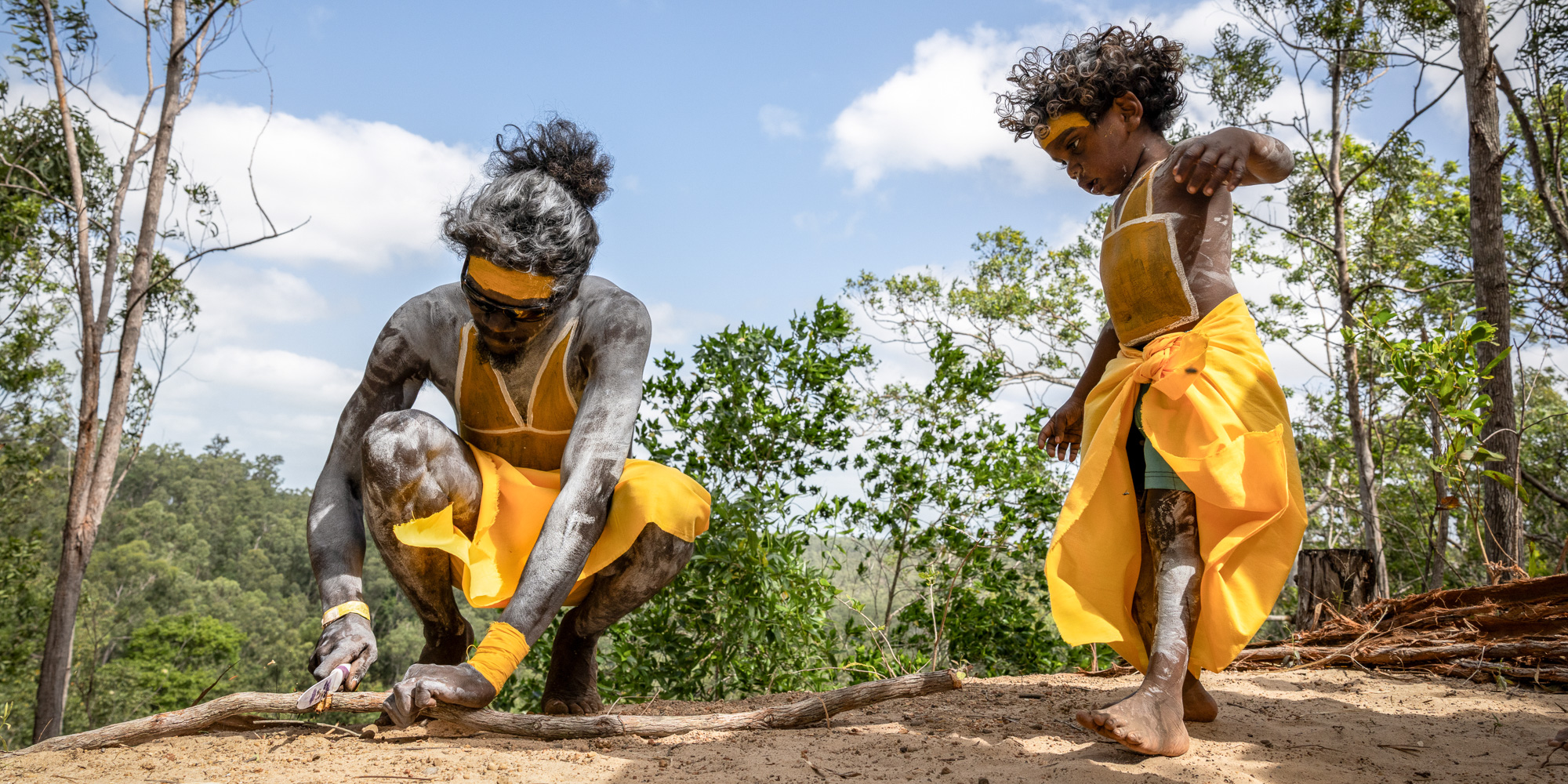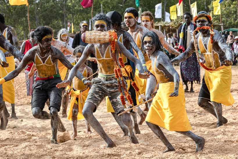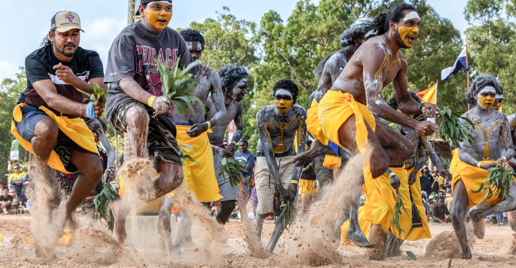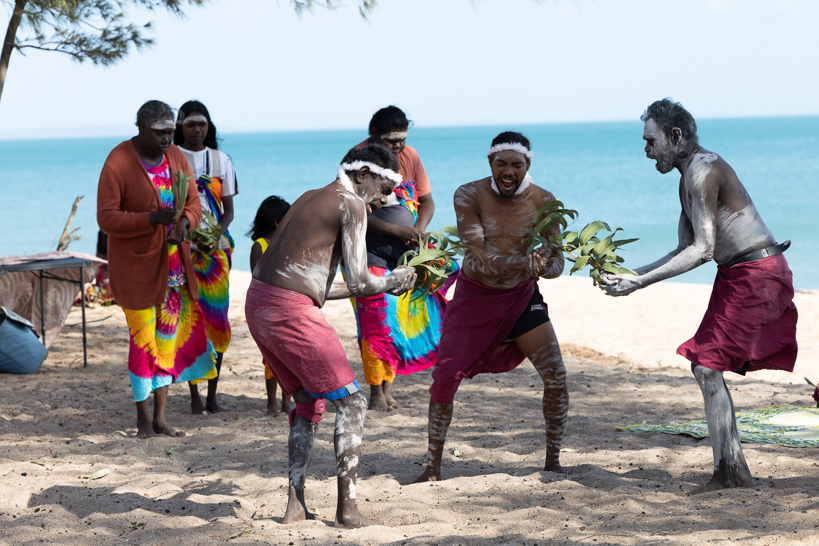 Les danseurs Red Flag de Numbulwar portent dans leurs bungguls la mémoire des premiers contacts maritimes avec les Macassans venus d'Indonésie. Leurs drapeaux rouges (jamajama) évoquent ces échanges anciens, inscrivant dans la danse une histoire de rencontres et de continuité culturelle.