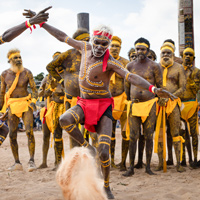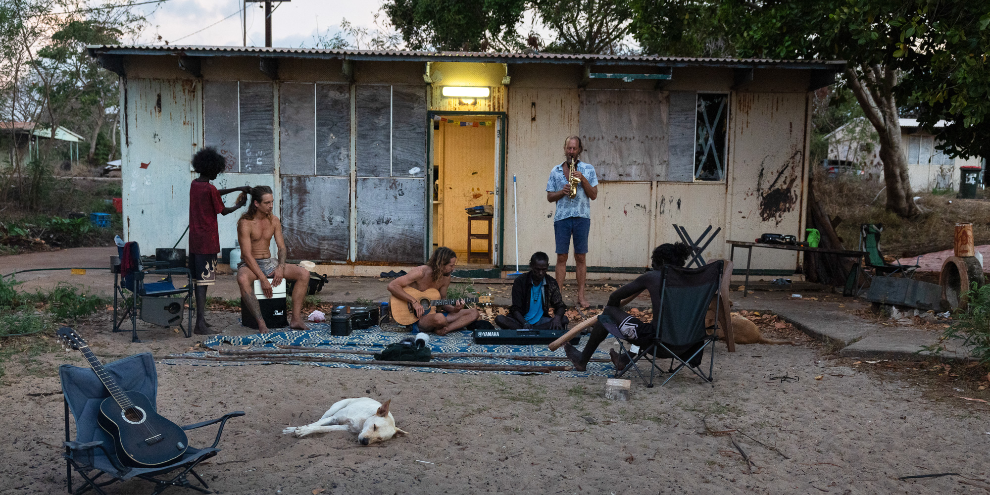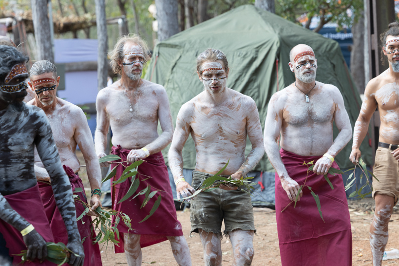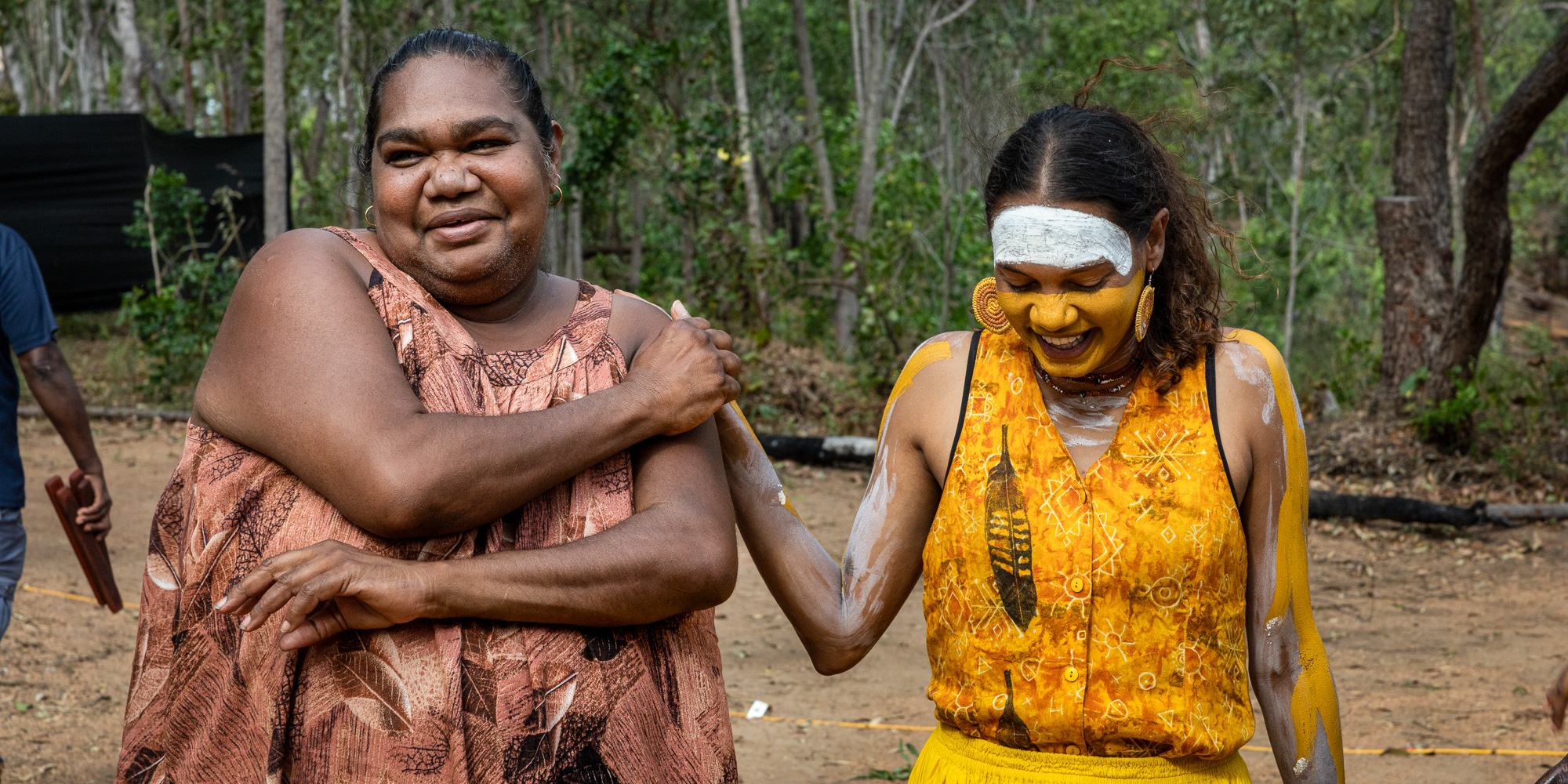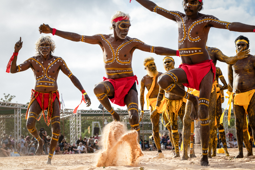 Les danseurs Red Flag de Numbulwar portent dans leurs bungguls la mémoire des premiers contacts maritimes avec les Macassans venus d'Indonésie. Leurs drapeaux rouges (jamajama) évoquent ces échanges anciens, inscrivant dans la danse une histoire de rencontres et de continuité culturelle.