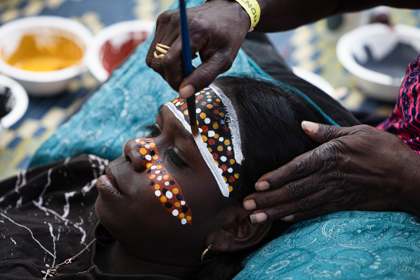 Sous les mains expertes d'une aînée, une jeune Yolngu reçoit les pigments sacrés de sa terre : rouge pour le feu, jaune pour le soleil, blanc pour l'éclair, noir pour la nuit. Plus que des ornements, ces miny'tji incarnent une carte vivante où se croisent le clan, le territoire et les ancêtres. Dans l'entrelacement des points, l'individu s'efface : son corps devient le support de la loi et de l'esprit.