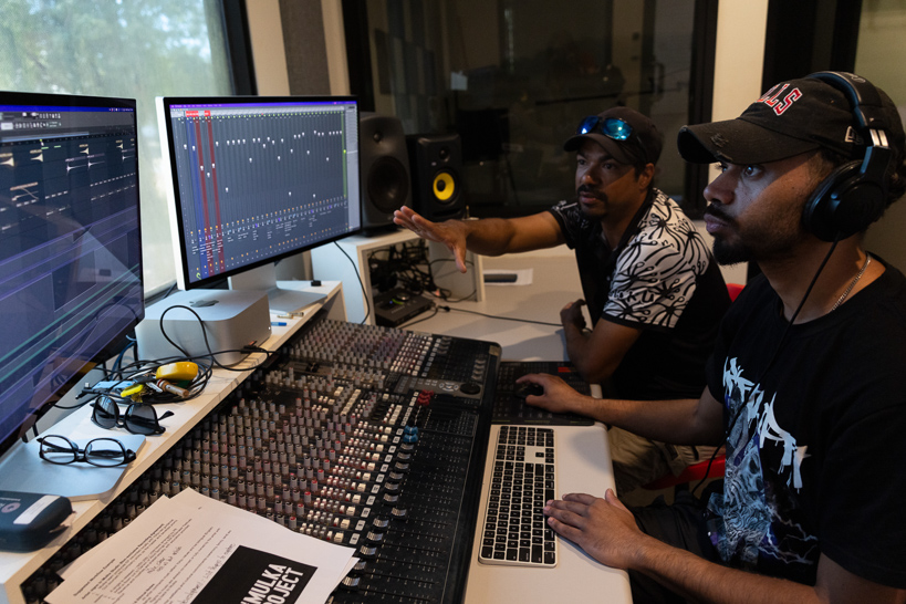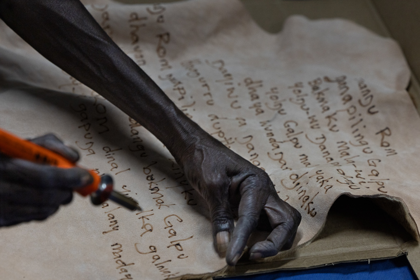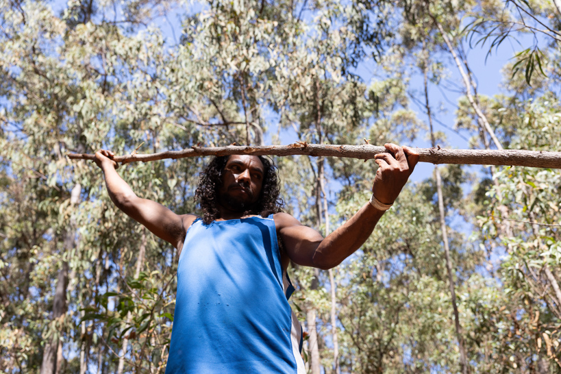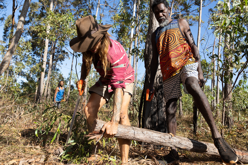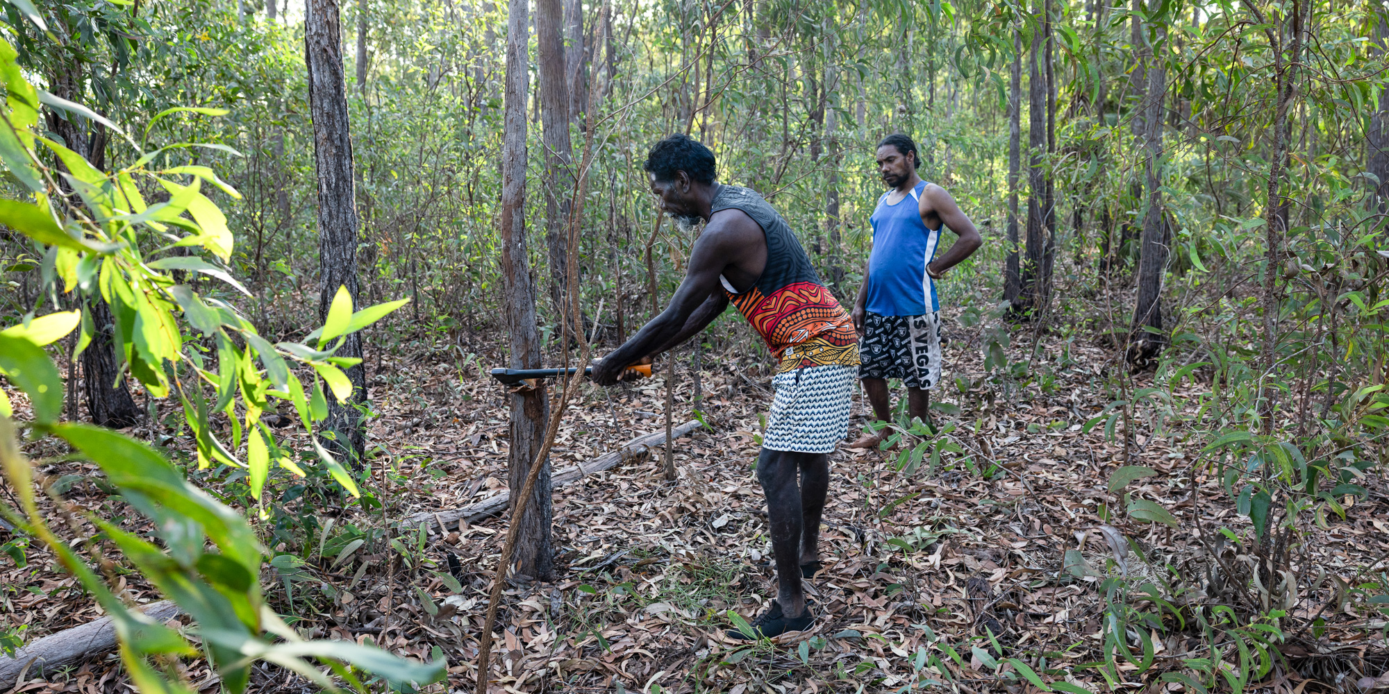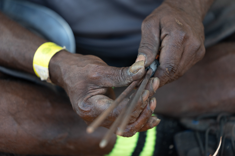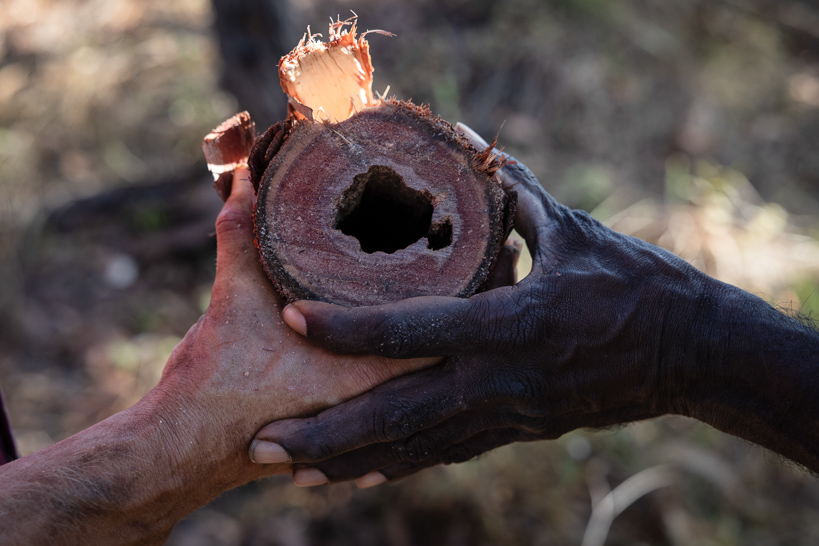 Le Yolngu Howie Gurruwiwi danse avec une tige pointée vers le sol : un geste qui rejoue la quête du miel sauvage. En suivant les traces des fourmis, il incarne une songline (carte cosmologique) de subsistance, où l'ancestral et le quotidien se rejoignent dans le rythme du bunggul (cérémonie rituelle).