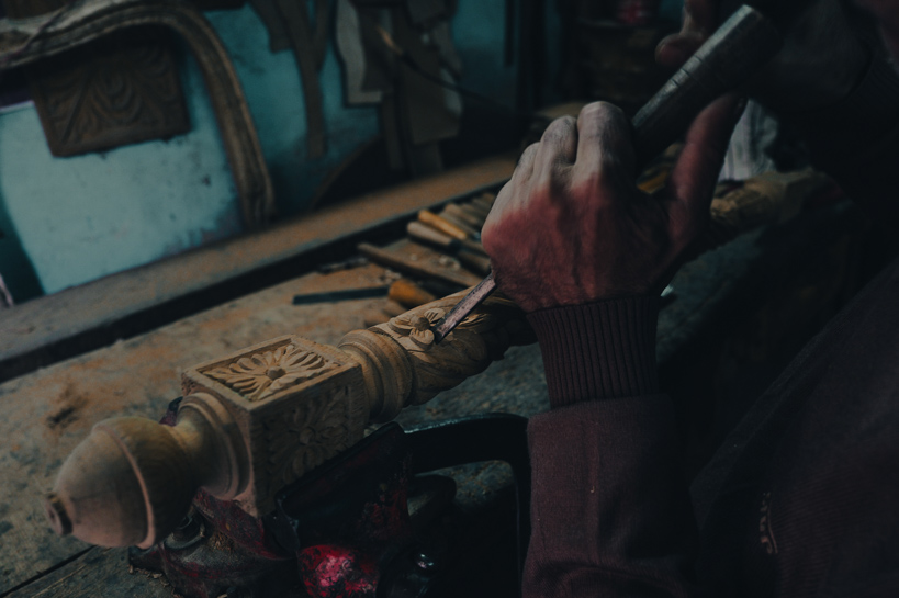 Al-Hattaba, Le Caire, Égypte. Un ébéniste sculpte un pied de lit dans son atelier, concentré sur les détails de chaque motif. Son travail manuel s'inscrit dans le paysage du quartier, où artisanat et vie domestique coexistent.