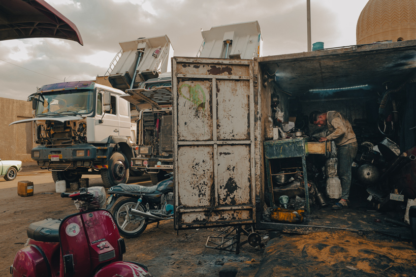 Al-Ghafeer, Le Caire, Égypte. Au cœur du cimetière, un mécanicien a installé son atelier dans un conteneur au milieu de la rue. Entouré de passants, il répare les véhicules avec ses outils posés à même le sol, s'appropriant l'espace public.
