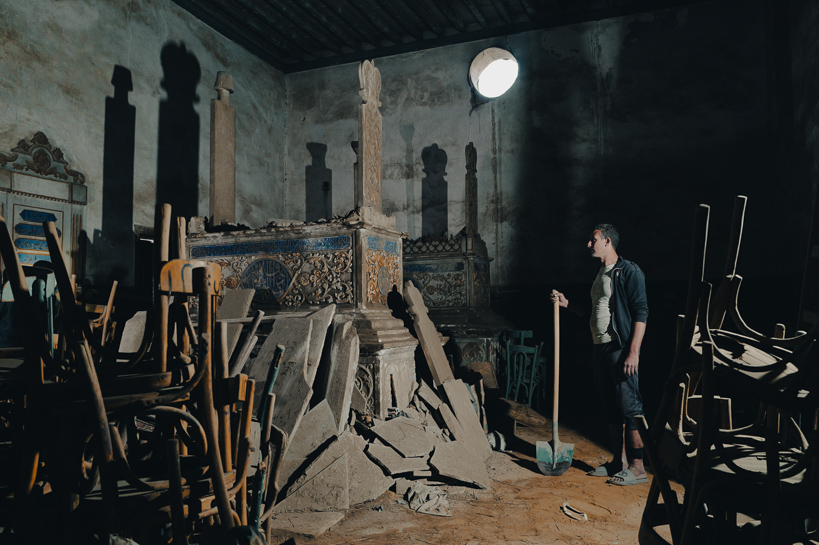 Al-Hattaba, Le Caire, Égypte. Adil vient prendre du matériel dans un mausolée du cimetière qui sert d'entrepôt pour les gardiens. On peut y voir des chaises qui peuvent servir pour les enterrements.