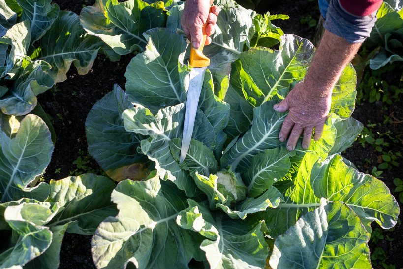Jean-Paul effectue le « premier coupage » d'un jeune chou-fleur d'été. Il rabat une feuille afin de protéger l'inflorescence du soleil et préserver sa blancheur.