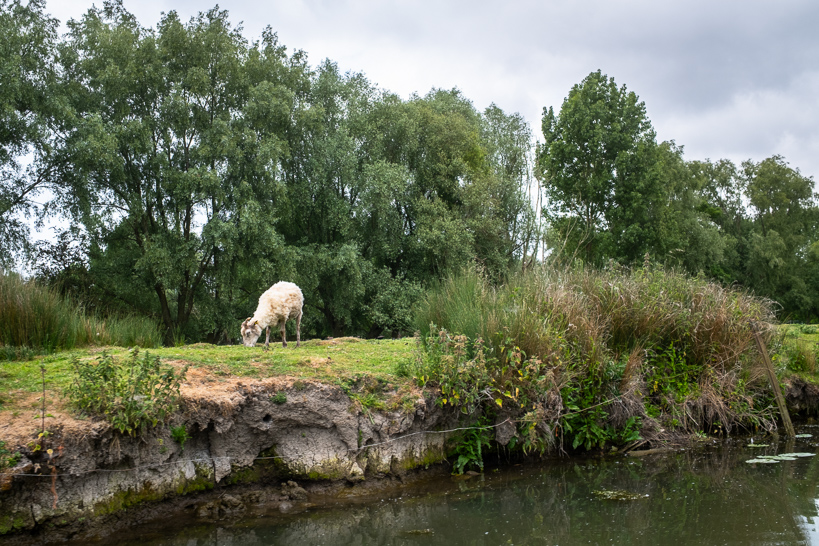 Un mouton paît au cœur du marais. Le Conservatoire du littoral et Eden 62, un gestionnaire d'espaces naturels sensibles, utilisent l'éco-pâturage pour entretenir certaines berges et limiter l'embroussaillement des mégaphorbiaies (friches humides). La fauche favorise une mosaïque d'habitats propice à la biodiversité.
