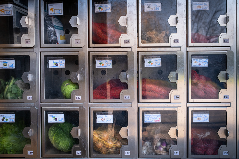 Alexandre applique un circuit court pour vendre ses carottes. En plus de la vente directe à la ferme, il utilise des casiers en libre-service et à toute heure. Ce système permet de vendre divers produits locaux, tout en maintenant vivant le lien entre producteurs et habitants.