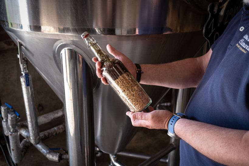 Laurent présente les différents grains d'orge entrant dans l'élaboration de ses bières, et provenant principalement de la région. « Nous utilisons l'appellation "bière d'abbaye" car la brasserie est située dans une ancienne abbaye qui produisait déjà de la bière en son temps », précise l'entrepreneur.