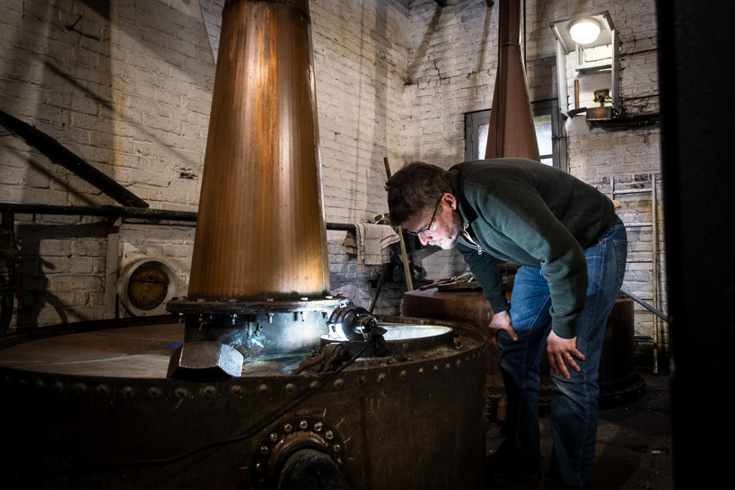 Lionel contrôle la chauffe dans l'un des deux alambics en cuivre historiques de la distillerie. Ici, la triple distillation se fait « à l'ancienne » pour préserver tous les arômes, c'est-à-dire à feu nu et sans colonne. C'est lors de la troisième « passe » que les baies de genévrier sont ajoutées. La qualité exige du temps : près de 40 heures de chauffe et 3,6 tonnes de céréales pour quelques flacons d'alcool précieux.