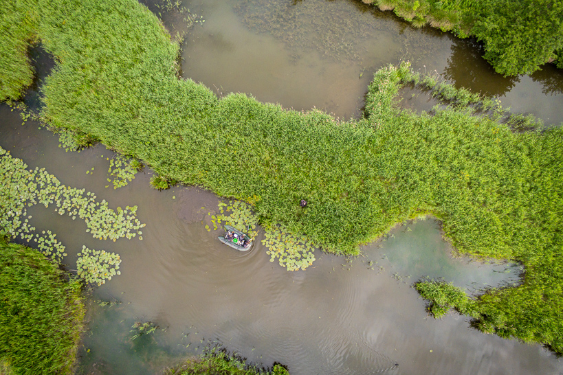 L'équipe de la Fédération de pêche du Pas-de-Calais réalise une pêche électrique à proximité d'une roselière où frayent les poissons. Il s'agit d'évaluer la présence de brochets juvéniles afin de contrôler le fonctionnement de cette zone humide récemment restaurée.