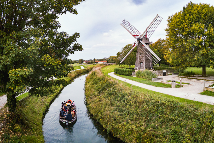Un groupe de visiteurs découvre le moulin de l'Aile construit dans les années 2010. Cet ouvrage est la copie de celui qui fut érigé en 1866 non loin de là, en bordure de la Petite Clémingue. Endommagé par une bourrasque en 1948, l'original fut démonté en 1983. Équipé d'une vis d'Archimède, il permettait de drainer quelque 50 hectares.