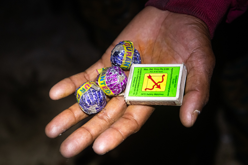 Chapanala, Assam, Inde. De petites bombes détonantes sont utilisées pour effaroucher les éléphants qui ravagent les cultures. Lors de l'explosion, ces artifices émettent un son puissant et une vive lumière. Si cette méthode est relativement inoffensive pour les pachydermes, certains villageois désemparés n'hésitent pas à confectionner des bombes dites « sales » en mélangeant un explosif artisanal avec des clous pour blesser les animaux.