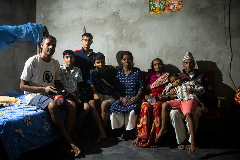 Jaribasa, Assam, Inde. À la nuit tombée, la famille Khatiwada attend le passage quotidien de plus de 200 éléphants dans le village. Au moindre bruit, les adultes inspecteront les alentours pour s'assurer qu'aucun éléphant ne s'approche de la maison. Le père (ci-contre à gauche) reçoit par téléphone des informations sur le déplacement du troupeau. La plupart des villageois utilisent les réseaux sociaux et les services de messagerie pour s'organiser et anticiper l'arrivée des pachydermes.
