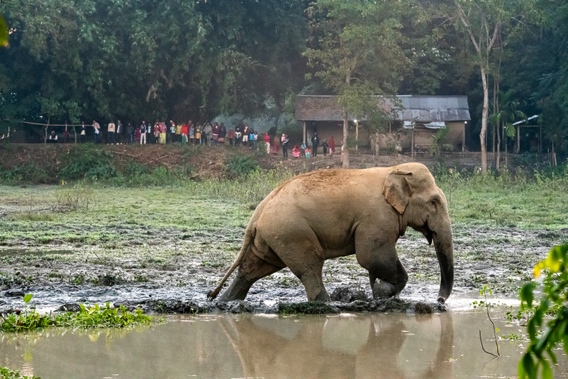 Jathipotia, Assam, Inde. Un éléphant traverse une parcelle sous le regard des villageois rassemblés sur une digue.