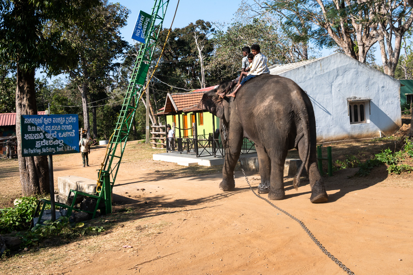Balle, Karnataka, Inde. Un cornac et deux compagnons pénètrent à dos d'éléphant dans le camp des adivasis, attenant à la Nagarahole Tiger Reserve. Pour de nombreux peuples autochtones, le métier de cornac constitue une activité traditionnelle, transmise entre générations, reposant sur une connaissance fine du comportement des éléphants et de la forêt.
