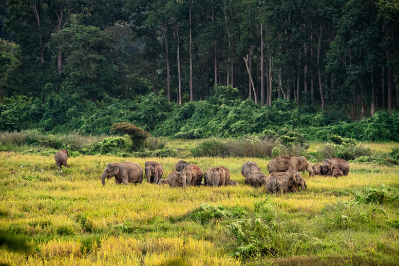 Hatikhuli, Assam, Inde. Un troupeau d'éléphants se nourrit au sein d'une parcelle de riz mise à leur disposition par des villageois et l'association Hati Bondhu. Ces champs communautaires, situés sur une importante route migratoire, sont aujourd'hui destinés à l'alimentation des pachydermes.