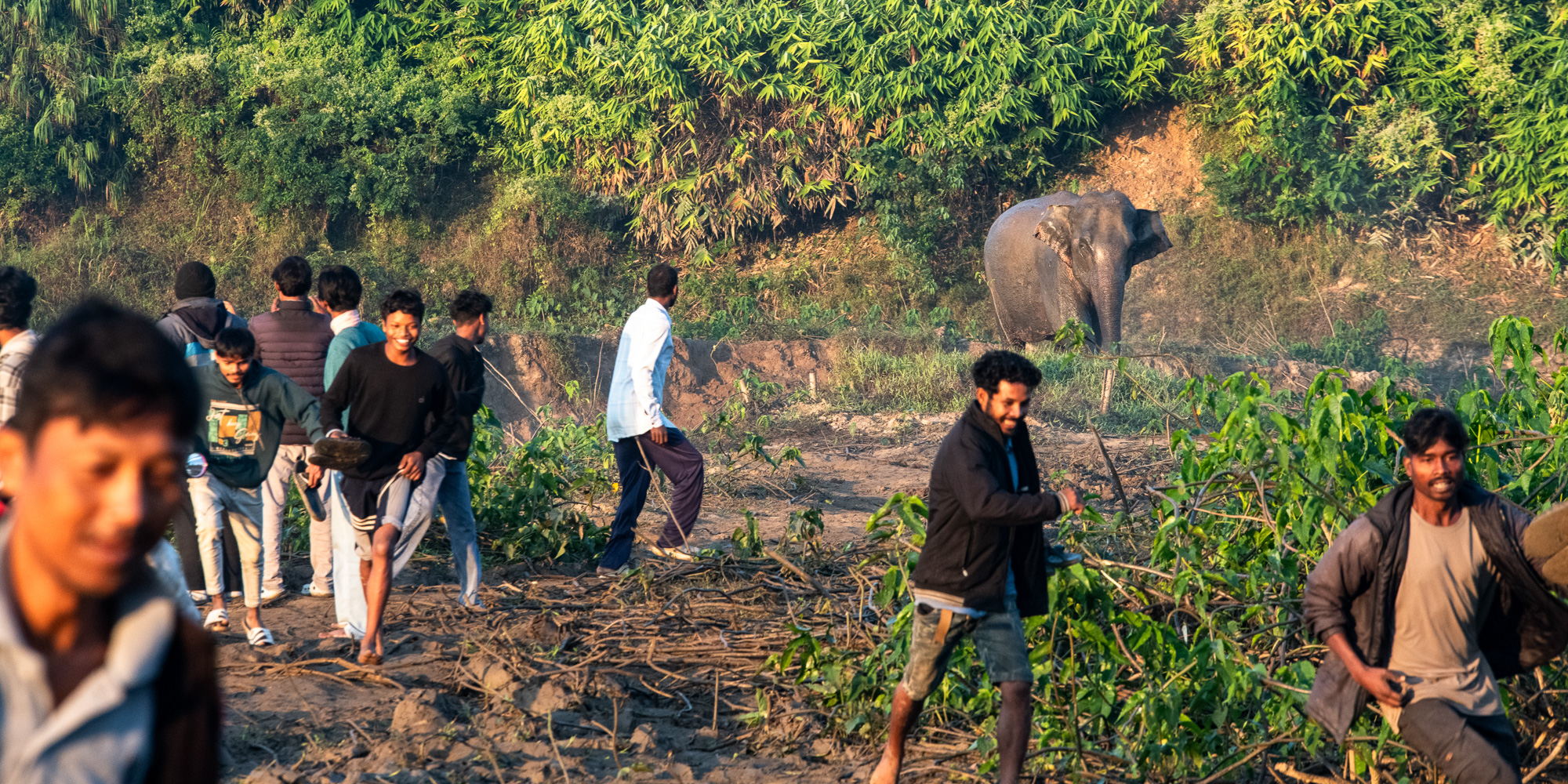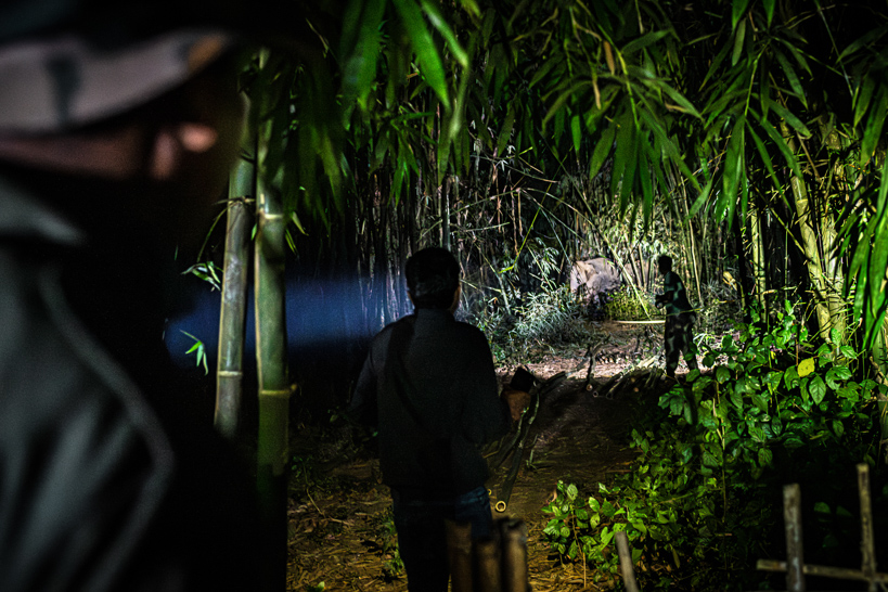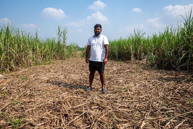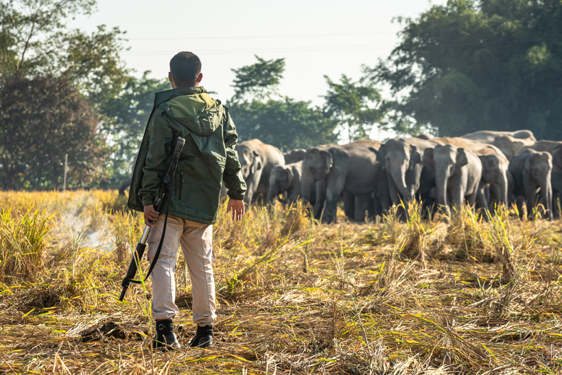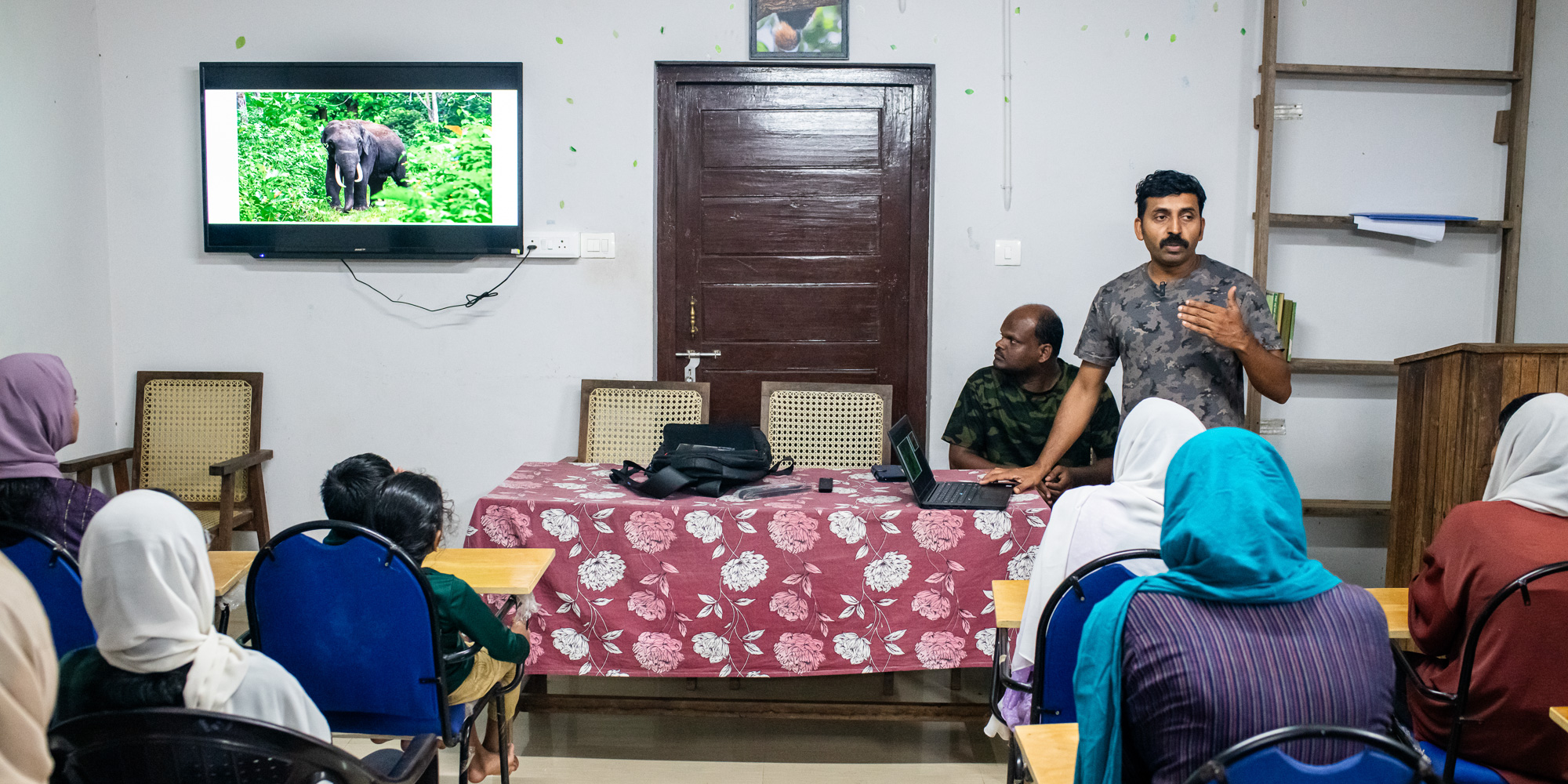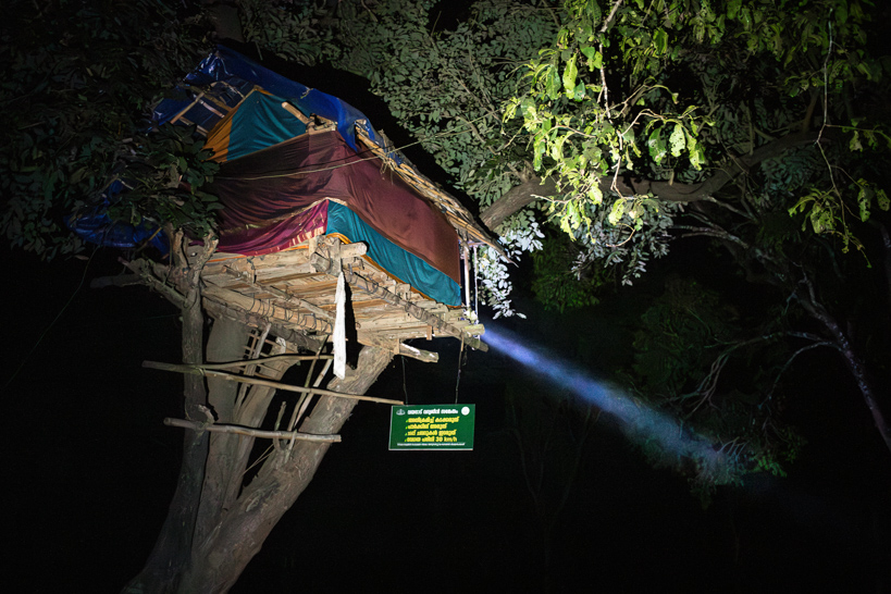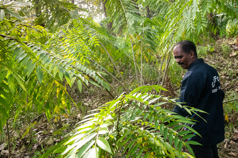 Shibukuttan, garde forestier, inspecte un jeune casse-marron (Senna spectabilis). Cette plante invasive a été introduite dans les années 1980 par le Gouvernement indien pour ombrager les routes et servir d'ornement. Elle s'est rapidement répandue dans les forêts méridionales du pays. Elle forme de denses bosquets, étouffe les espèces locales et modifie la chimie des sols. Ces feuilles, qui ne sont pas comestibles, privent les herbivores de nourriture.