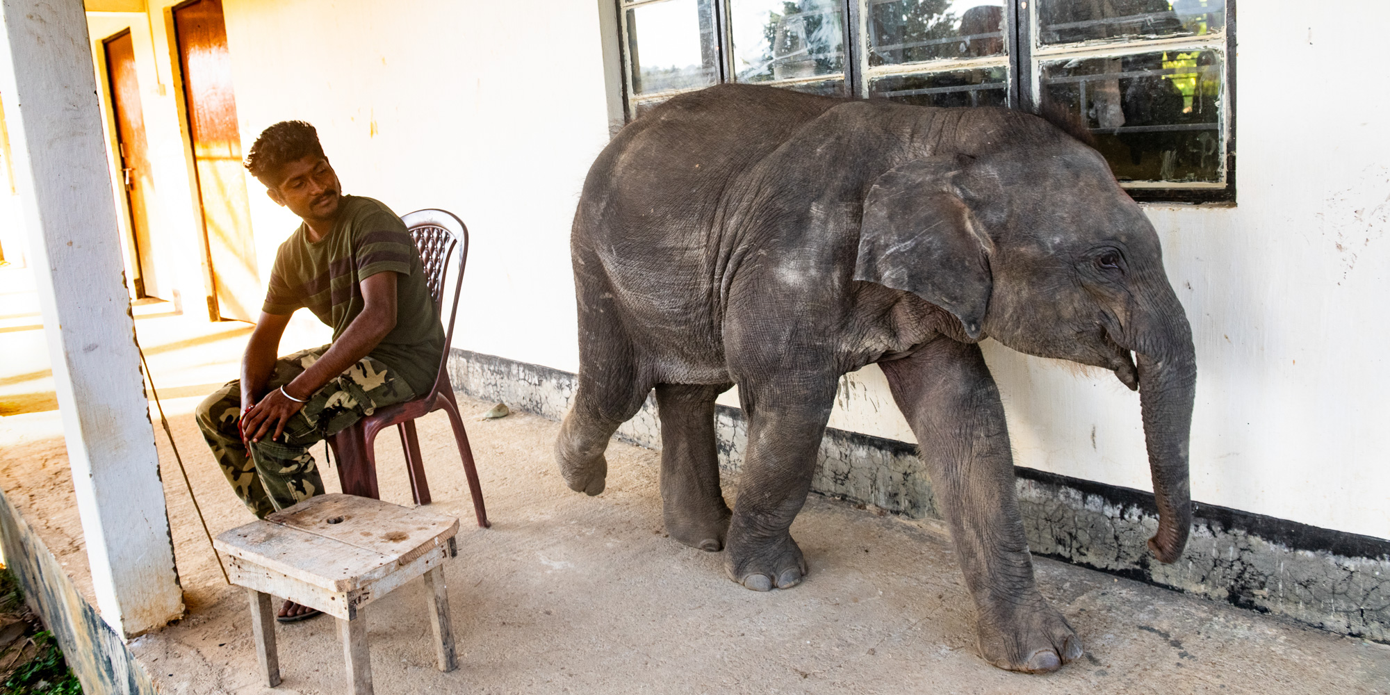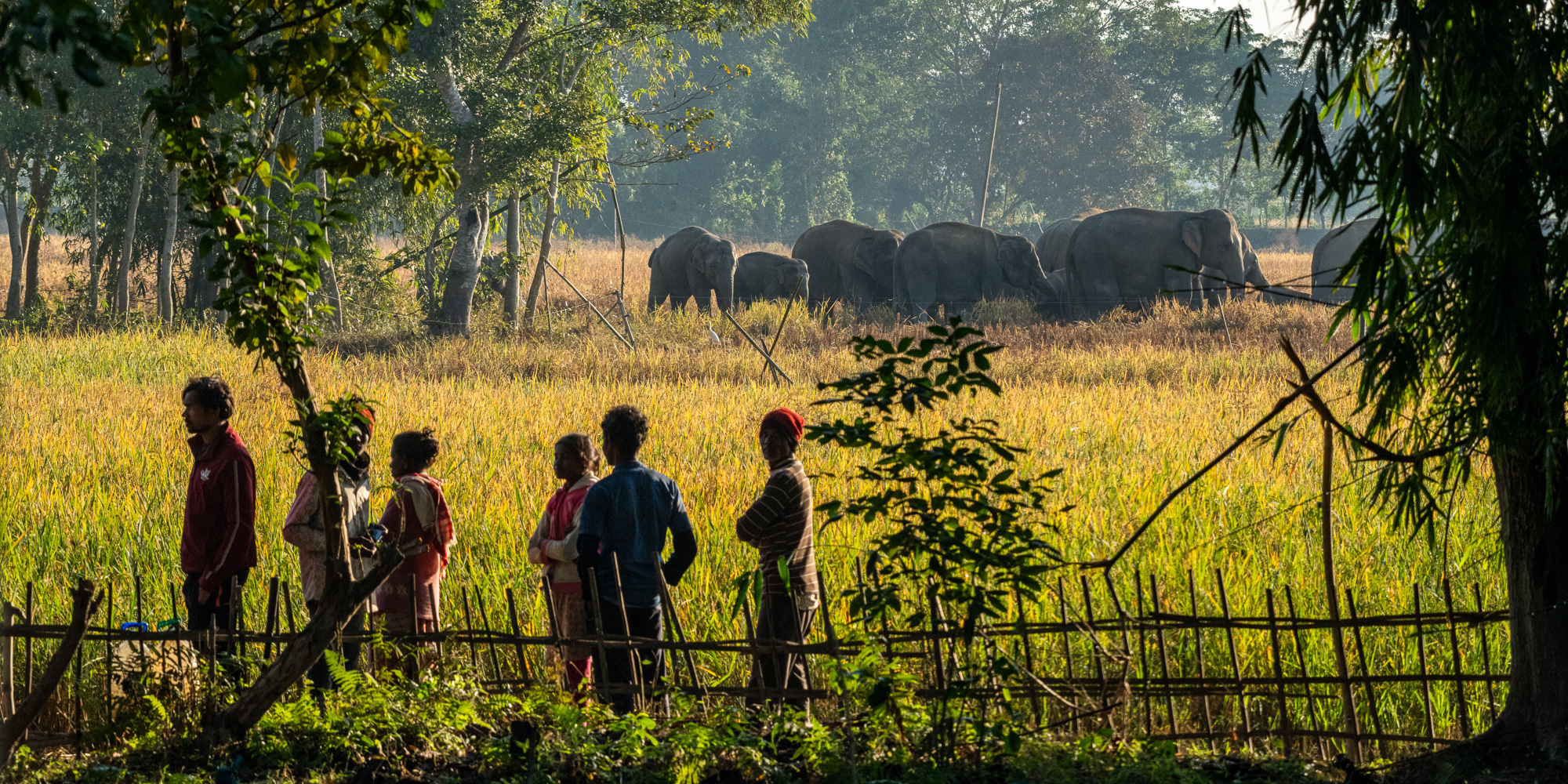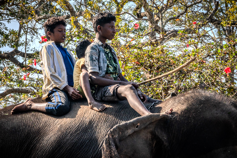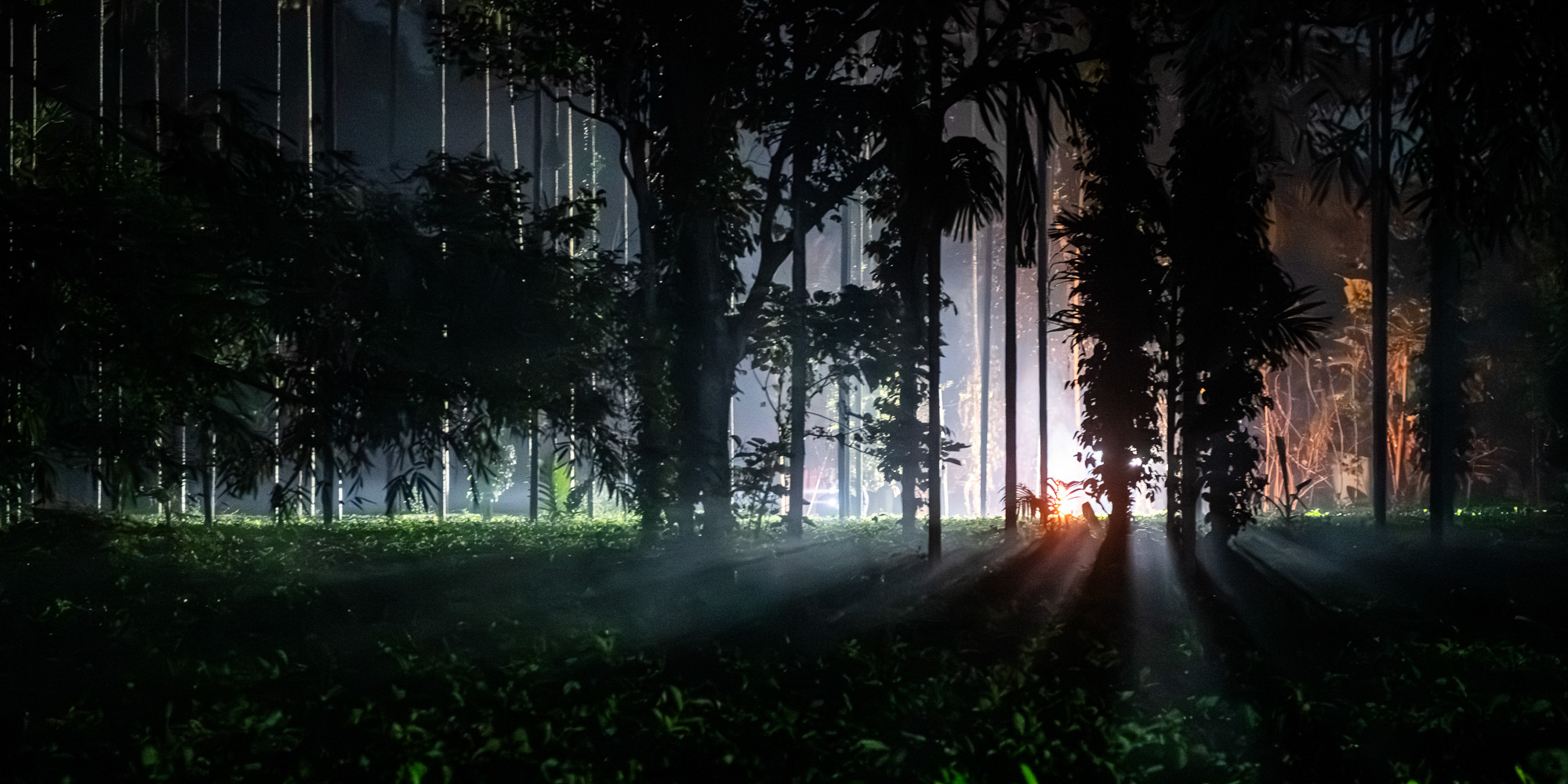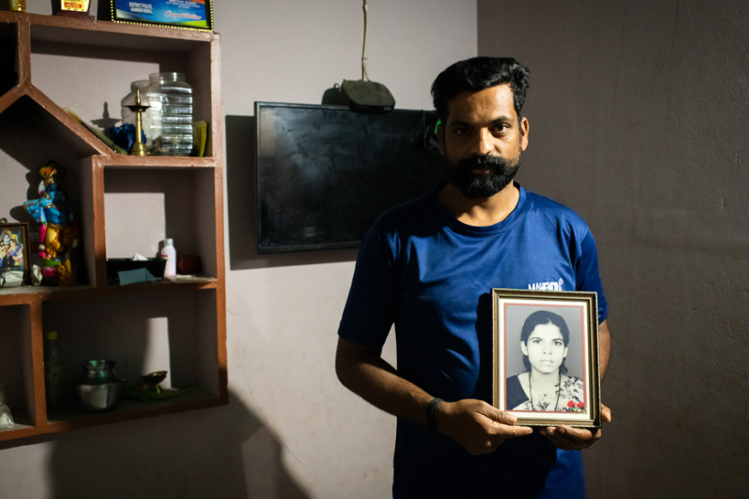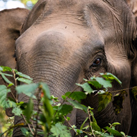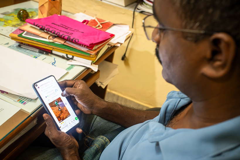Shibukuttan, garde forestier, inspecte un jeune casse-marron (Senna spectabilis). Cette plante invasive a été introduite dans les années 1980 par le Gouvernement indien pour ombrager les routes et servir d'ornement. Elle s'est rapidement répandue dans les forêts méridionales du pays. Elle forme de denses bosquets, étouffe les espèces locales et modifie la chimie des sols. Ces feuilles, qui ne sont pas comestibles, privent les herbivores de nourriture.