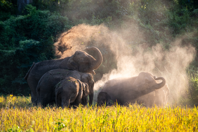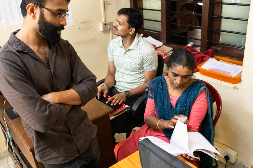 Des employés du service des forêts procèdent au comptage des grumes de teck issues des forêts de la Réserve faunistique de Wayanad. Environ un tiers de ce massif est couvert de plantations d'arbres tels que le teck (Tectona grandis), le palissandre (Dalbergia latifolia), l'eucalyptus et le silver oak (Grevillea robusta), souvent introduits pour la production de bois d'œuvre ou pour servir d'ombrage aux cultures (thé, café, épices).