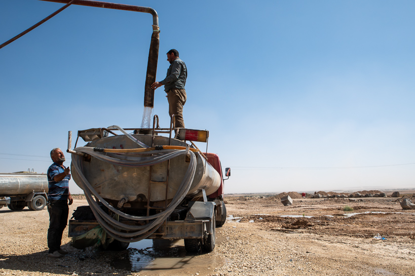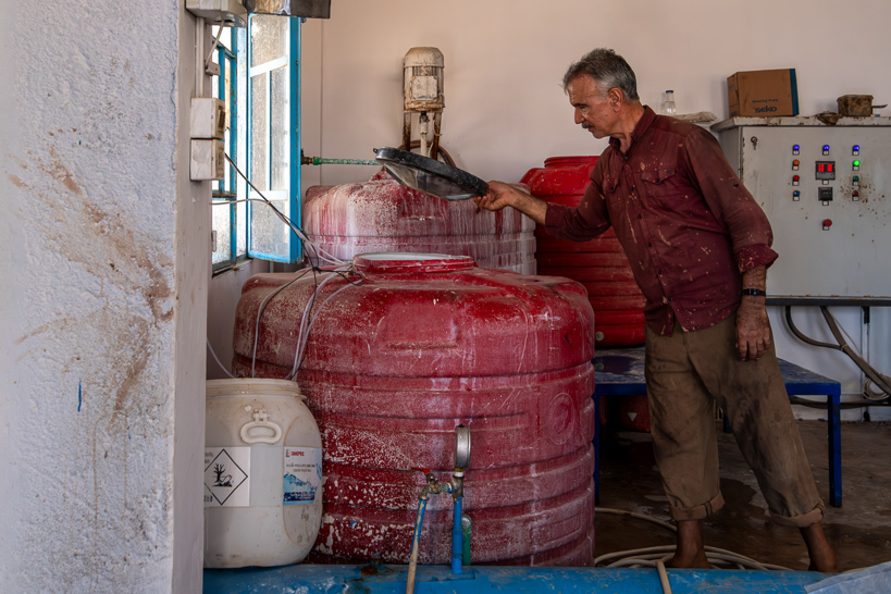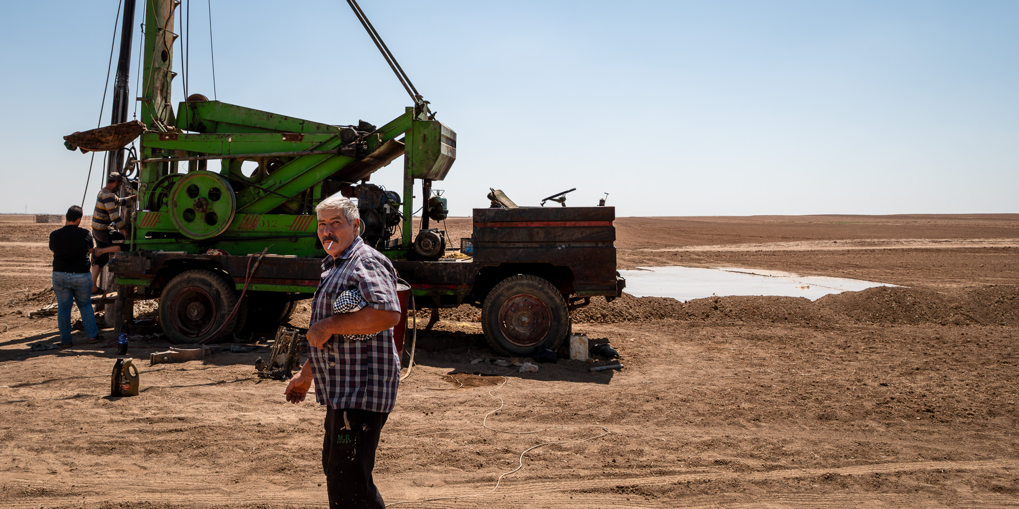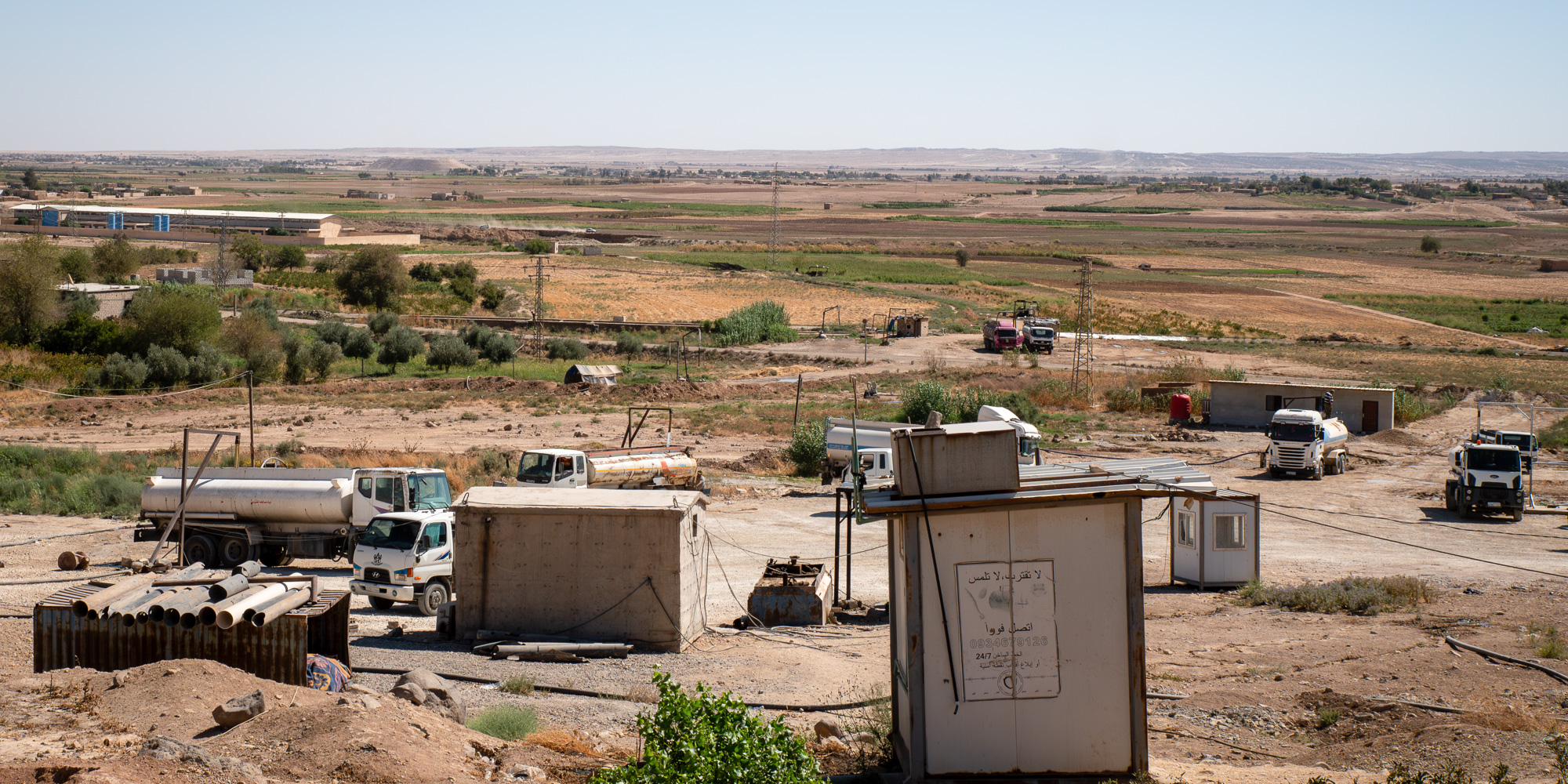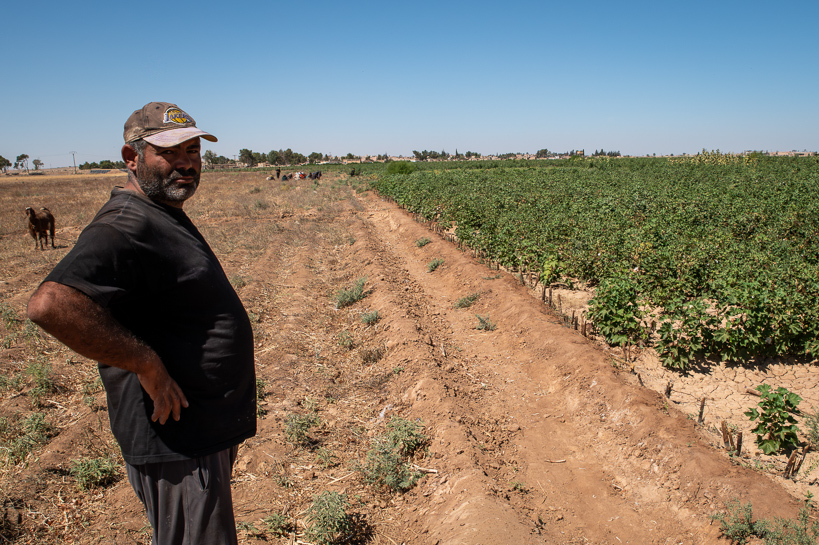Haitam supervise la récole sur des terres qu'il exploite en fermage. « Ici avant, on cultivait du coton et du blé en abondance grâce au système d'irrigation fourni par Hassaké ou Serê Kaniyê, mais tous deux se sont arrêtés », se rappelle l'agriculteur. Maintenant que la Khabour est asséchée, il doit changer progressivement pour du cumin, de l'orge et des légumes (oignons, carottes). « Ces cultures consomment moins d'eau que le coton et le blé, mais aujourd'hui on dépend des puits, ce qui nécessite beaucoup d'énergie pour le pompage », explique-t-il. Haitham utilise des panneaux solaires pour pomper dans un puits d'eau non potable et irriguer ses cultures, mais les autres puits restent inutilisés par manque de carburant. Pour fournir de l'eau à sa famille, il commande un camion-citerne d'eau chaque semaine en provenance de la région d'Hassaké.