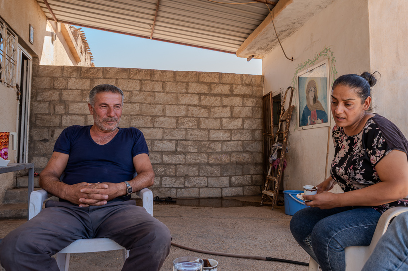 Samir et Amira Abraham sont un couple de fermiers assyriens, une communauté chrétienne du Nord-Est de la Syrie. Ils n'ont pas fui la guerre, et avec leurs proches, ils font partie des trois dernières familles restantes dans leur village, près de Tall Tamr. Derrière leurs champs, un bras de la rivière Khabour, désormais tarie, était utilisé pour l'irrigation jusqu'à la fin des années 1990. « Les puits construits à Serê Kaniyê permettaient ensuite, avec les quelques pluies, d'obtenir de l'eau pour continuer l'agriculture en été, mais aujourd'hui ce n'est plus possible », confie Samir. Ils n'utilisent leurs terres plus qu'en hiver pour un peu de blé et des légumes, faute d'eau et de moyens pour irriguer le reste de l'année. L'eau de consommation, elle, doit être importée par camion-citerne depuis que la station de pompage d'Alouk est occupée par la Turquie.