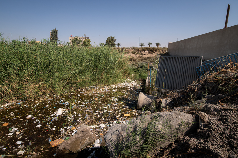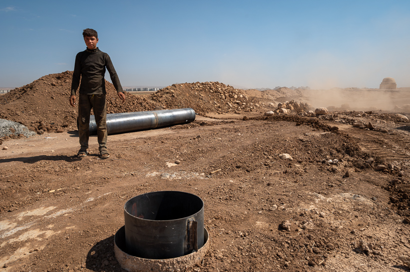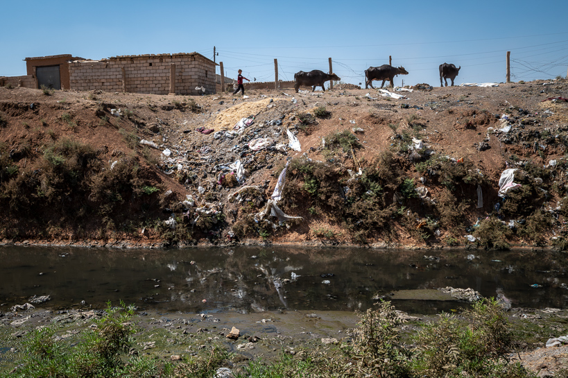 Un jeune garçon guide quelques buffles du troupeau familial sur les rives presque sèches et polluées d'un bras de la rivière Jaghjagh, à Qamishlo. Sa famille élève ces animaux depuis plusieurs générations, une activité héritée de leurs ancêtres venus d'Irak il y a plus de cinquante ans. Autrefois source de vie et d'abondance, la Turquie a coupé le flux du fleuve Jaghjagh et a commencé à y déverser ses eaux usées, ce qui a contaminé les eaux jusqu'à Qamishlo et entraîné la propagation de maladies.